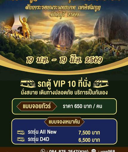 #ประเพณีสักการะรอยพระพุทธบาทเขาคิชฌกูฏ ปีพ.ศ 2567 🚩 รอบค่ำ 19.00 น.ออกเดินทางจาก กทม. 🚩 ขึ้นเขาสักการะรอยพระพุทธบาทเขาคิชฌกูฏ 5-6 ชั่วโมง 🚩 เวลา 06.00 น. เดินทางไปทะเล 🚩 เวลา 08.00 น ทานข้าวร้านซุปเปอร์แมนซีฟู้ด แหลมแม่พิมพ์ จอดที่นี่ 2-3 ชั่วโมง 👌👌👌 🚩 เวลา 11.00 น. เดินทางกลับ กทม 🚩 เวลา 14:00 น… เพิ่มเติม ดูเพิ่มเติม : https://www.facebook.com/100031131232158/posts/1183104726070557 เพจ Facebook : รถตู้ไปเขาคิชกุฏจันทบุรี [vid_embed] รถตู้ให้เช่า.com รถตู้รับเหมา บริการให้เช่ารถตู้พร้อมคน